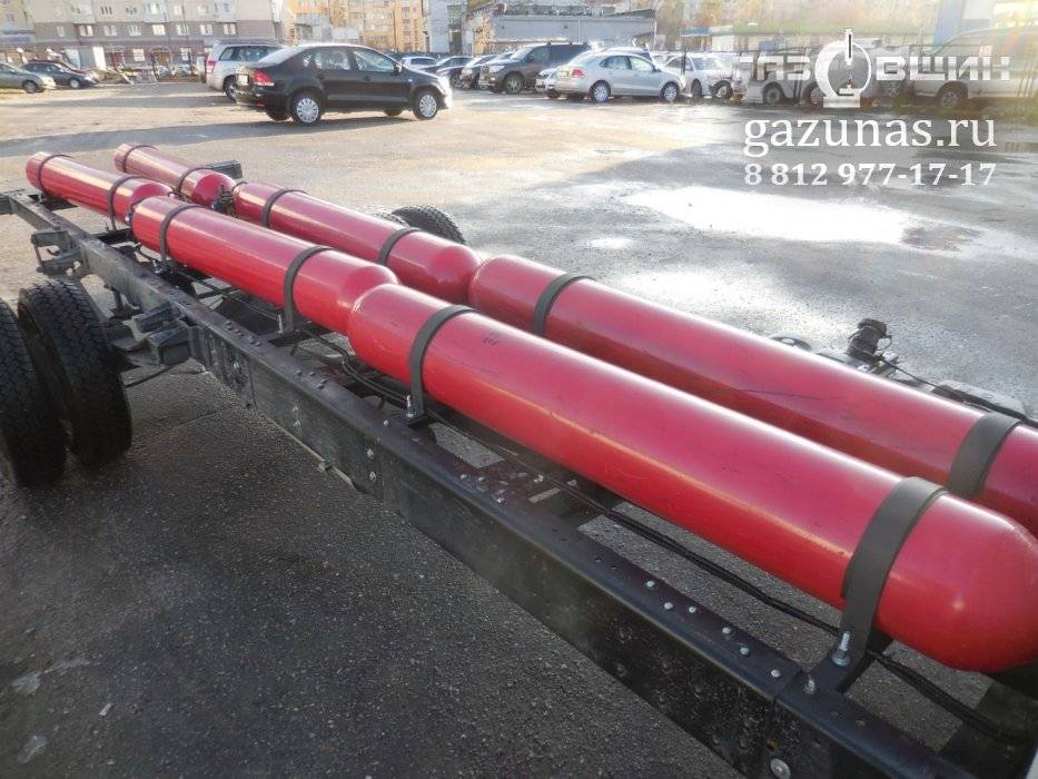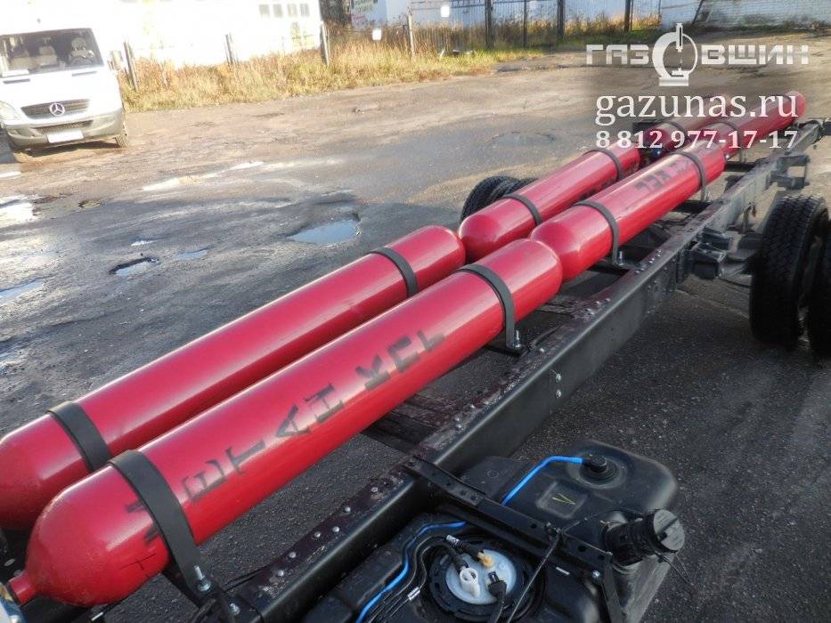 б) 4 цилиндрических баллонов объемом по 50л, общий объём 200л. (заправочная емкость 47 кубометров сжатого природного газа) под борт автомобиля